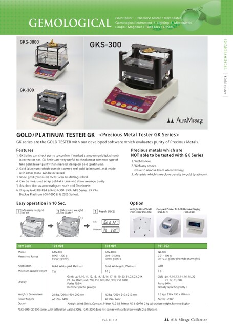 GEMOLOGICALGoldtesterGEMOLOGICALGoldtester|Diamondtester/GemtesterGemologicalinstrument|Lighting|MicroscopeLoupe/Magnifier|Tweezers/OthersVol.11/2GOLD/PLATINUMTESTERGK<PreciousMetalTesterGKSeries>GKseriesaretheGOLDTESTERwithourdevelopedsoftwarewhichevaluatespurityofPreciousMetals.ItemCodeModelApplicationMinimumsampleweightWeight/DimensionsPowerSupplyOption*GKS-300/GK-300comeswithcalibrationweight200g.GKS-3000doesnotcomeswithcalibrationweight2kg(Option).101-006GKS-300Gold,Whitegold,Platinum2g2.8kg/260x190x200mmAC100-240V101-007GKS-3000Gold,Whitegold,Platinum10g4.2kg/260x240x240mmAC100-240V101-002GK-300Gold5g1.5kg/218x190x170mmAC100-240VMeasuringRangeDisplay0.001-300g(0.001g/cm3)Gold:Lo,9,10,11,12,13,14,15,16,17,18,19,20,21,22,23,24KPT:Lo,Pt600,650,700,750,800,850,900,950,1000Purity99.9%Density(specificgravity)0.01-3000g(0.01g/cm3)0.01-300g(0-0.01g/cm3dependsonweight)Gold:Lo,9,10,12,14,16,18,2021,22,23,24KPurity99%Density(specificgravity)AirtightWindShield,CompactPrinterAL2-58,PrinterAD-8129TH,2kgcalibrationweight,RemotedisplayEasyoperationin10Sec.OptionMeasureweightinair1Measureweightinwater2%%GoldPlatinumResult(GKS)3AirtightWindShield(950-028/950-024)CompactPrinterAL2-58(950-022)RemoteDisplay(950-036)Features1.GKSeriescancheckpuritytoconfirmifmarkedstampongold(platinum)iscorrectornot.GKSeriesareveryusefultocheckmostcommontypeoffakegold:lowerpuritythanmarkedstampongold(platinum).2.Gold(platinum)whichoutsidecoveredrealgold(platinum),andinsidewithothermetalcanbedetected.3.None-gold(platinum)metalscanbedistinguished.4.Canbemeasuredscrapgoldatatimeandshowaveragepurity.5.AlsofunctionasanormalgramscaleandDensimeter.6.DisplayGoldK9-K24&%(GK-300:99%,GKSSeries:99.9%).DisplayPlatinum600-1000&%(GKSSeries).PreciousmetalswhichareNOTabletobetestedwithGKSeries1.Withhallow.2.Withanystones(havetoremovethemwhentesting).3.Materialswhichhaveclosedensitytogold(platinum).GKS-3000GK-300GKS-300AlfaMirageCollection