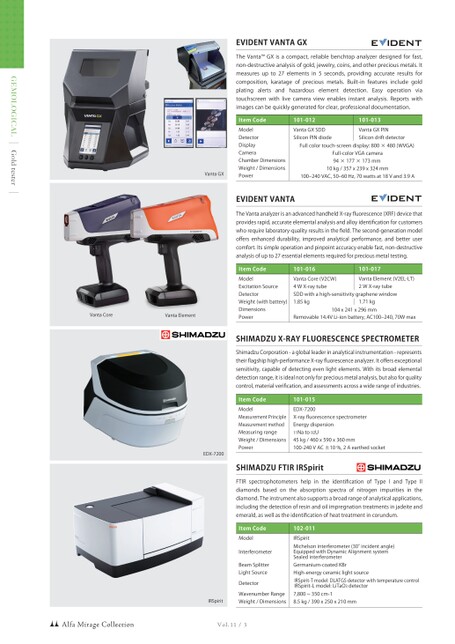 GEMOLOGICALGoldtesterVol.11/3VantaGXEDX-7200VantaCoreVantaElementItemCodeModelExcitationSourceDetectorWeight(withbattery)DimensionsPower101-016VantaCore(V2CW)4WX-raytubeSDDwithahigh-sensitivitygraphenewindow1.85kgRemovable14.4VLi-ionbattery,AC100‒240,70Wmax101-017VantaElement(V2EL-LT)2WX-raytube1.71kgEVIDENTVANTATheVantaanalyzerisanadvancedhandheldX-rayfluorescence(XRF)devicethatprovidesrapid,accurateelementalanalysisandalloyidentificationforcustomerswhorequirelaboratory-qualityresultsinthefield.Thesecond-generationmodeloffersenhanceddurability,improvedanalyticalperformance,andbetterusercomfort.Itssimpleoperationandpinpointaccuracyenablefast,non-destructiveanalysisofupto27essentialelementsrequiredforpreciousmetaltesting.104x241x296mmSHIMADZUX-RAYFLUORESCENCESPECTROMETERShimadzuCorporation-agloballeaderinanalyticalinstrumentation-representstheirflagshiphigh-performanceX-rayfluorescenceanalyzer.Itoffersexceptionalsensitivity,capableofdetectingevenlightelements.Withitsbroadelementaldetectionrange,itisidealnotonlyforpreciousmetalanalysis,butalsoforqualitycontrol,materialverification,andassessmentsacrossawiderangeofindustries.ItemCodeModelMeasurementPrincipleMeasurementmethodMeasuringrangeWeight/DimensionsPower101-015EDX-7200X-rayfluorescencespectrometerEnergydispersion11Nato92U45kg/460x590x360mm100-240VAC±10%,2AearthedsocketItemCodeModelDetectorDisplayCameraChamberDimensionsWeight/DimensionsPower101-012VantaGXSDDSiliconPINdiode101-013VantaGXPINSilicondriftdetectorEVIDENTVANTAGXTheVanta™GXisacompact,reliablebenchtopanalyzerdesignedforfast,non-destructiveanalysisofgold,jewelry,coins,andotherpreciousmetals.Itmeasuresupto27elementsin5seconds,providingaccurateresultsforcomposition,karatageofpreciousmetals.Built-infeaturesincludegoldplatingalertsandhazardouselementdetection.Easyoperationviatouchscreenwithlivecameraviewenablesinstantanalysis.Reportswithimagescanbequicklygeneratedforclear,professionaldocumentation.Fullcolortouch-screendisplay:800×480(WVGA)Full-colorVGAcamera94×177×173mm10kg/357x239x324mm100‒240VAC,50‒60Hz,70wattsat18Vand3.9ASHIMADZUFTIRIRSpiritFTIRspectrophotometershelpintheidentificationofTypeIandTypeIIdiamondsbasedontheabsorptionspectraofnitrogenimpuritiesinthediamond.Theinstrumentalsosupportsabroadrangeofanalyticalapplications,includingthedetectionofresinandoilimpregnationtreatmentsinjadeiteandemerald,aswellastheidentificationofheattreatmentincorundum.Michelsoninterferometer(30°incidentangle)EquippedwithDynamicAlignmentsystemSealedinterferometerIRSpirit-Tmodel:DLATGSdetectorwithtemperaturecontrolIRSpirit-Lmodel:LiTaO3detectorItemCodeModelInterferometerBeamSplitterLightSourceDetectorWavenumberRangeWeight/Dimensions102-011IRSpiritGermanium-coatedKBrHigh-energyceramiclightsource7,800~350cm-18.5kg/390x250x210mmAlfaMirageCollectionIRSpirit