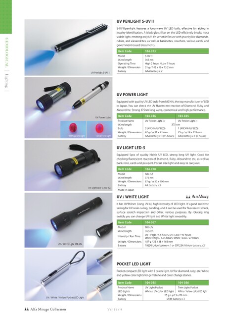 GEMOLOGICALVol.11/9LightingAlfaMirageCollectionUV/White/YellowPocketLEDLightItemCodeProductNameLEDLightsWeight/DimensionsBattery104-055UVLightPocketWhite/UVcolorLEDlightPOCKETLEDLIGHTPocketcompactLEDlightwith2colorslight.UVfordiamond,ruby,etc.Whiteandyellowcolorlightsforgemstoneandcolorchangestones.104-056TwinLightPocketWhite/YellowcolorLEDlight15g/φ13x70mmLR44batteryx3UVLightLED-5ABL-5ZItemCodeModelWavelengthWeight/DimensionsBatteryMadeinJapan104-070ABL-5Z375nm87g/φ30x100mmAAbatteryx3UVLIGHTLED-5Equipped5pcsofqualityNichiaUVLED,stronglongUVlight.GoodforcheckingfluorescentreactionofDiamond,Ruby,Alexandriteetc,aswellasbanknote,cardsandpassport.Pocketsizelightandeasytocarryout.UVPowerLightItemCodeProductNameWavelengthBulbWeight/DimensionsBattery104-036UVPowerLight-33(NICHIAUVLED)47g/φ31x93mmAAAbatteryx3(15hours)UVPOWERLIGHTEquippedwithqualityUVLEDbulbfromNICHIA,thetopmanufacturerofLEDinJapan.YoucanchecktheUVfluorescentreactionofDiamond,RubyandAlexandrite.Strong375nmlongwave,economicalandhighperformance.104-035UVPowerLight-11(NICHIAUVLED)25g/φ14x133mmAAAbatteryx1(6hours)375nmItemCodeModelWavelengthOperatingTimeWeight/DimensionBattery104-073S-UVⅡ365nmHigh2hours/Low7hours31g/142x16x13.2mmAAAbatteryx2UVPENLIGHTS-UVⅡS-UVⅡpenlightfeaturesalong-waveUVLEDbulb,effectiveforaidinginjewelryidentification.AblackglassfilterontheLEDefficientlyblocksmostvisiblelight,emittingonlyUV.It'sversatileforusewithjewelrylikediamonds,rubies,andalexandrites,aswellasbanknotes,vouchers,variouscards,andgovernment-issueddocuments.UV/WhiteLghtMR-UVItemCodeModelWavelengthWeight/DimensionsBattery104-067MR-UV365nmUV:High/5.5hours,UV:Low/40hoursWhite:High/3.75hours,White:Low/27hours187g/26x38x168mm18650Li-Ionbatteryx1orCR123Alithiumbatteryx2UV/WHITELIGHTIthasUV365nm(LongUV-A),highintensityofLEDlight.ItʼsgoodandtimesavingforUVresincuring,bonding,anditcanbeusedforfluorescentcheck,surfacescratchinspectionandother.variouspurposes.Byrotatingringswitch,youcanchangeUVlightandWhitelightsmoothly.Intensity/RunTimeWithoutUVlightUnderUVlightUVPenlightS-UVⅡ