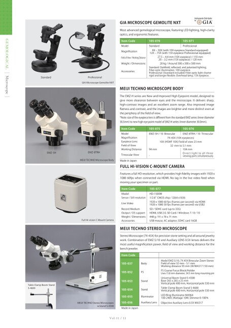 GEMOLOGICALVol.11/11MicroscopeItemCodeModelSensor/StillresolutionRecordMediumOutput/OSsupportWeight/DimensionsAccessories105-077HD-1500M1/2.8″CMOSchip/3264x1836SD/SDHCcard(upto32G)HDMI,USB2.0,SDCard/Windows7/8/10448g/91x78x71mmUSBmouse,ACadaptor,SDHCcard16GBFULLHI-VISIONC-MOUNTCAMERAFeaturesafullHDresolution,whichprovideshighfidelityimageswith1920x108060fpswhenconnectedviaHDMI.Nolaginthelivevideofeedwhenmovingyourspecimenorpart.1920x108060fps(framespersecond)viaHDMI1920x108030fps(framespersecond)viaUSB2LiveVideoAlfaMirageCollectionItemCodeModelMagnificationFieldofView/WorkingDistanceWeight/DimensionsAccessories105-070StandardMostadvancedgemologicalmicroscope,featuringLEDlighting,high-clarityoptics,andergonomicfeatures.105-071Professional8X‒50X(with10XeyepieceStandardequipped)12X‒75X(with15XeyepieceProfessionalequipped)27.5‒4.4mm(10Xeyepiece)/110mm20‒3.2mm(15Xeyepiece)/120mm20kg/Around300x300x500mmStandard:Darkfield,reflected,andpolarizedlighting,Fiberopticillumination.10Xeyepiece.Professional:(Standardincluded)Fiberopticlightshorterrigidandlongerflexible.Overheadlamp,15Xeyepiece.MEIJITECHNOStereoMicroscopesw/standS-4300TableClampBoomStandS-4600MEIJITECHNOSTEREOMICROSCOPEStereoMicroscope(7X-45X)forprecisionstonesettingandallaroundjewelrywork.CombinationofEMZ-5/10andAuxiliaryLENS0.5Xlensesdeliversthemostusefulmagnificationpower,fieldofviewandworkingdistanceforthebenchjeweler.ItemCode105-037105-052105-053105-054105-055105-056BodyFSStandStandIlluminatorAuxiliaryLensModelEMZ-5/10,7X-45XBinocularZoomStereoFieldofview32mm-5.1mmWorkingdistance93mm(W/MA517150mm)FSCoarseFocusBlock/HolderUses15.8mmdiameter,34.5mmlongmountingpinUniversalBoomStandS-4300Base265x265x25mmVerticalpole400mm,Horizontalpole530mmTableClampBoomStandS-4600Verticalpole400mm,Horizontalpole530mmObjectiveAuxiliaryLens0.5XMA517LEDRingIlluminatorMA964100-240V,Wattage10W,Dimmer0-100%MadeinJapanMadeinJapanGIAMicroscopeGemoliteNXTStandardEMZ-5HEMZ-8TRHProfessionalGIAMICROSCOPEGEMOLITENXTItemCodeModelMagnificationEyepieceLensFieldofViewWorkingDistanceTrinocularView105-075EMZ-5H/10Binocular94mm-TheEMZ-HseriesareNewandImprovedHighEyepointmodel,designedtogivemoreclearancebetweeneyesandthemicroscope.Itdeliverssharp,high-contrastimagesandanexcellentzoomrange.Alsoimprovedimageflatnessandcontrast,andtheimagesarebrighterandmoredistinctevenattheperipheryofthefieldofview.*Note:sizeoftheeyepiecelensisdifferentfromthestandardEMZseries(Innerdiameter30.5mm)tonewhigh-eyepointmodelofEMZ-Hseries(Innerdiameter30.0mm).105-076EMZ-8TRH/10Trinocular104mmDirectlighttoallthreeviewingportssimultaneouslyMEIJITECHNOMICROSCOPEBODY7X-45X(10Xeyepieces)10X(HSWF10X)Fieldofview23mm32mmto5.1mmMEIJITECHNOMicroscopeBodyFullHi-visionCMountCamera
