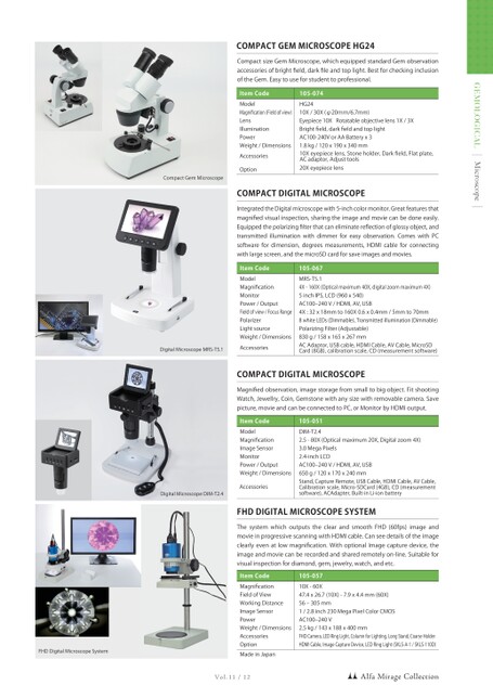 GEMOLOGICALVol.11/12MicroscopeDigitalMicroscopeDIM-T2.4DigitalMicroscopeMRS-T5.1ItemCodeModelMagnificationMonitorPower/OutputFieldofview/FocusRangePolarizerLightsourceWeight/Dimensions105-067MRS-T5.14X-160X(Opticalmaximum40X,digitalzoommaximum4X)5inchIPS,LCD(960x540)AC100‒240V/HDMI,AV,USB4X:32x18mmto160X0.6x0.4mm/5mmto70mm8whiteLEDs(Dimmable)、Transmittedillumination(Dimmable)PolarizingFilter(Adjustable)830g/158x165x267mmCOMPACTDIGITALMICROSCOPEIntegratedtheDigitalmicroscopewith5-inchcolormonitor.Greatfeaturesthatmagnifiedvisualinspection,sharingtheimageandmoviecanbedoneeasily.Equippedthepolarizingfilterthatcaneliminatereflectionofglossyobject,andtransmittedilluminationwithdimmerforeasyobservation.ComeswithPCsoftwarefordimension,degreesmeasurements,HDMIcableforconnectingwithlargescreen,andthemicroSDcardforsaveimagesandmovies.ACAdaptor,USBcable,HDMICable,AVCable,MicroSDCard(8GB),calibrationscale,CD(measurementsoftware)AccessoriesItemCodeModelMagnificationImageSensorMonitorPower/OutputWeight/Dimensions105-051DIM-T2.42.5-80X(Opticalmaximum20X,Digitalzoom4X)3.0MegaPixels2.4-inchLCDAC100‒240V/HDMI,AV,USB650g/120x170x240mmCOMPACTDIGITALMICROSCOPEMagnifiedobservation,imagestoragefromsmalltobigobject.FitshootingWatch,Jewellry,Coin,Gemstonewithanysizewithremovablecamera.Savepicture,movieandcanbeconnectedtoPC,orMonitorbyHDMIoutput.AccessoriesStand,CaptureRemote,USBCable,HDMICable,AVCable,Calibrationscale,Micro-SDCard(4GB),CD(measurementsoftware),ACAdapter,Built-inLi-ionbatteryFHDDigitalMicroscopeSystemItemCodeMagnificationFieldofViewWorkingDistanceImageSensorPowerWeight/DimensionsAccessoriesOptionMadeinJapan105-05710X-60X47.4x26.7(10X)-7.9x4.4mm(60X)56‒305mm1/2.8inch230MegaPixelColorCMOSAC100‒240V2.5kg/143x188x400mmFHDCamera,LEDRingLight,ColumnforLighting,LongStand,CoarseHolderHDMICable,ImageCaptureDevice,LEDRingLight(SKLS-A-1/SKLS-110D)FHDDIGITALMICROSCOPESYSTEMThesystemwhichoutputstheclearandsmoothFHD(60fps)imageandmovieinprogressivescanningwithHDMIcable.Canseedetailsoftheimageclearlyevenatlowmagnification.WithoptionalImagecapturedevice,theimageandmoviecanberecordedandsharedremotelyon-line.Suitableforvisualinspectionfordiamond,gem,jewelry,watch,andetc.ItemCodeModelMagnification(Fieldofview)LensIlluminationPowerWeight/DimensionsOption105-074HG2410X/30X(φ20mm/6.7mm)Eyepiece10XRotatableobjectivelens1X/3XBrightfield,darkfieldandtoplightAC100-240VorAABatteryx31.8kg/120x190x340mm20XeyepiecelensCOMPACTGEMMICROSCOPEHG24CompactsizeGemMicroscope,whichequippedstandardGemobservationaccessoriesofbrightfield,darkfileandtoplight.BestforcheckinginclusionoftheGem.Easytouseforstudenttoprofessional.10Xeyepiecelens,Stoneholder,Darkfield,Flatplate,ACadaptor,AdjusttoolsAccessoriesAlfaMirageCollectionCompactGemMicroscope