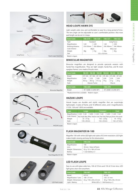 GEMOLOGICALLoupe/MagnifierStandardBlackItemCodeModel*ReplacementlensavailableMadeinJapan106-269HF-10ABC(3LENSSET)106-270HF-20ABC(3LENSSET)ItemCodeModelMagnificationWeightStyle106-259HF-10A2.0X36.5gBINOCULARMAGNIFIERBinocularmagnifiersaredesignedtoprovidespectaclewearerswithhands-freemagnification.Theyarelightweight,hands-free,andfitmosteyeglassframes.LensmadeofAcrylicresin.106-261HF-10C3.0X41.5g106-263HF-20B2.5X21g106-260HF-10B2.5X38.5g106-262HF-20A2.0X19g106-264HF-20C3.0X24gCliponGlassesFrameTypeMagnificationColor(frame)WeightStyleMadeinJapan1.32X1.85X1.32X1.6X1.85X1.32X1.6XLarge1.6XHAZUKILOUPEHazukiloupesaredurableandstylishmagnifierthataresurprisinglylightweight.3stylesofframe,and10differentcolors,and3magnifications(1.32X,1.6Xand1.85X)areavailable.CompactCoolRed,Purple,Black,White,Titaniumcolor,Pearl,Ruby,Blackgray,Brown,Newpurple22-27.5g145x45mm18.3-22.6g142x35mm16-19.5g142x27.3mmItemCodeTypeMagnificationWorkingdistanceColor(frame)WeightSizeMadeinJapan106-3191.6X250-350mm38gHEADLOUPEHAWKEYELightweightwideviewandcomfortabletowearforalongperiodoftime.Thelensanglecanbeadjustabletouserʼscomfortableposition.Alsonosepadlengthcanbesetin4steps.106-3202.0X200-300mm41g106-3211.6X290-390mm42gLongFocusWinered133x167mm106-3222.0X240-340mm45gHeadLoupeHawkEyeLongFocusStandardBinocularMagnifierHAZUKILoupeVol.11/14AlfaMirageCollectionLEDFlashLoupeItemCodeModelMagnification/LensWeight/DimensionsLight/Battery106-087R751910X/27mm42g/105x38x25mmLEDFLASHLOUPEEasytousewithglasswidelens,10Xof27mmand15Xof21mmlens.LEDlightgivesclearviewanywhere.106-161R752615X/21mm50g/104x38x33mmWhiteLEDx1/AAAbatteryx3FlashMagnifierM-100ItemCodeMagnificationLensWeight/DimensionsBatteryMadeinJapan106-23610X30mm/Glass&Plastic95g/52x180x47mmCsizebatteryx2FLASHMAGNIFIERM-100Magnifier10XwithwhiteLEDlightandscalesof0.5mmresolution.LEDlightmakesbrightviewingandeasyfortheobservation.LargeCompactCool