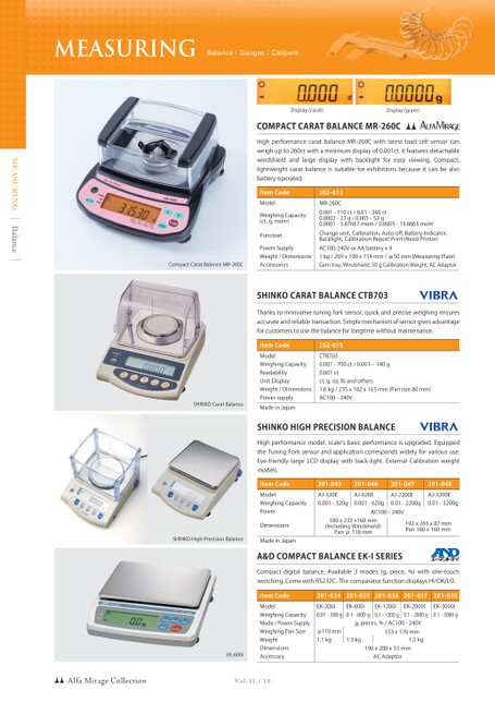 MEASURINGBalanceVol.11/19MEASURINGBalance|Gauges/CalipersItemCodeModelWeighingCapacityReadabilityUnitDisplayWeight/DimensionsPowersupplyMadeinJapan202-015CTB7030.001-700ct/0.001‒140g0.001ctct,g,oz,lbandothers1.6kg/235x182x165mm(Pansize80mm)AC100-240VSHINKOCARATBALANCECTB703Thankstoinnovativetuningforksensor,quickandpreciseweighingensuresaccurateandreliabletransaction.Simplemechanismofsensorgivesadvantageforcustomerstousethebalanceforlongtimewithoutmaintenance.AlfaMirageCollectionItemCodeModelWeighingCapacityMode/PowerSupplyWeighingPanSizeWeightDimensionsAccessory201-034EK-300i0.01-300gφ110mm1.1kg201-035EK-600i0.1-600g1.3kg201-036EK-1200i0.1-1200g201-037EK-2000i0.1-2000g201-038EK-3000i0.1-3000gA&DCOMPACTBALANCEEK-ISERIESCompactdigitalbalance.Available3modes(g,piece,%)withone-touchswitching.ComewithRS232C.ThecomparatorfunctiondisplaysHI/OK/LO.g,pieces,%/AC100-240V1.5kg133x170mm190x200x53mmACAdaptorCompactCaratBalanceMR-260CDisplay(gram)Display(carat)COMPACTCARATBALANCEMR-260CHighperformancecaratbalanceMR-260Cwithlatestloadcellsensorcanweighupto260ctwithaminimumdisplayof0.001ct.Itfeaturesdetachablewindshieldandlargedisplaywithbacklightforeasyviewing.Compact,lightweightcaratbalanceissuitableforexhibitionsbecauseitcanbealsobatteryoperated.ItemCodeModelPowerSupplyWeight/DimensionsAccessories202-012MR-260C0.001-110ct/0.01-260ct0.0002-22g/0.001-52g0.0001-5.87667mom/0.0005-13.8665momChangeunit,Calibration,Auto-off,BatteryIndicator,Backlight,CalibrationReportPrint(NeedPrinter)AC100-240VorAAbatteryx41kg/209x190x114mm/φ50mm(MeasuringPlate)Gemtray,Windshield,50gCalibrationWeight,ACAdaptorWeighingCapacity(ct,g,mom)FunctionItemCodeModelWeighingCapacityPowerMadeinJapan201-045AJ-320E0.001-320g201-046AJ-620E0.001-620g201-047AJ-2200E0.01-2200g201-048AJ-3200E0.01-3200gSHINKOHIGHPRECISIONBALANCEHighperformancemodel,scaleʼsbasicperformanceisupgraded.EquippedtheTuningForksensorandapplicationcorrespondswidelyforvarioususe.Eye-friendlylargeLCDdisplaywithback-light.ExternalCalibrationweightmodels.AC100-240VDimensions180x235x168mm(IncludingWindshield)Panφ118mm192x265x87mmPan180x160mmSHINKOCaratBalanceSHINKOHighPrecisionBalanceEK-600i