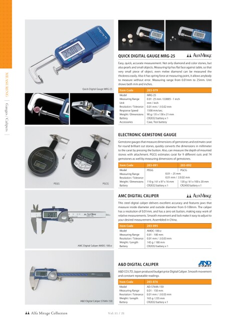 MEASURINGGauges/CalipersVol.11/21AlfaMirageCollectionPGCGItemCodeModelMeasuringRangeResolution/ToleranceWeight/DimensionsBattery203-091PEGG110g/61x97x16mmCR2032batteryx1203-092PGCG120g/61x100x20mmCR2450batteryx1ELECTRONICGEMSTONEGAUGEGemstonegaugesthatmeasuredimensionsofgemstonesandestimatecaratforroundbrilliantcutstones,quicklyconvertsthedimensionsinmillimetertothecaratbypressingthebutton.Also,canmeasurethedepthofmountedstoneswithattachment.PGCGestimatescaratfor9differentcutsand74gemstonesaswellbymeasuringdimensionsofgemstones.PEGGQuickDigitalGaugeMRG-25ItemCodeModelMeasuringRangeUnitResolution/ToleranceResponseSpeedWeight/DimensionsBatteryAccessories203-079MRG-250.01-25mm/0.0005-1inchmm/inch0.01mm/±0.02mm1500mm/sec.90g/35x138x21mmCR2032batteryx1Case,TestbatteryQUICKDIGITALGAUGEMRG-25Easy,quick,accuratemeasurement.Notonlydiamondandcolorstones,butalsopearlsandsmallobjects.Measuringtiphasflatfaceagainsttable,sothatverysmallpieceofobject,evenmeleediamondcanbemeasuredthethicknesseasily.Alsoithasspringforceatmeasuringpoint,itallowsanybodytomeasurewithouterror.Measuringrangefrom0.01mmto25mm.Unitshowsbothmmandinches.AMCDigitalCaliperAMDC-100αItemCodeModelMeasuringRangeResolution/ToleranceWeight/LengthBattery203-095AMDC-100α0.01-100mm0.01mm/±0.03mm145g/180mmCR2032batteryx1AMCDIGITALCALIPERThissteeldigitalcaliperdeliversexcellentaccuracyandfeaturesjawsthatmeasureinsidediameterandoutsidediameterfrom0-100mm.Thecaliperhasaresolutionof0.01mm,andhasazerosetbutton,makingeasyworkofrelativemeasurements.Smoothmovementandlockmakeiteasytoadjusttoyourdesiredmeasurement.AssembledinChina.A&DDigitalCaliper5764A-150ItemCodeModelMeasuringRangeResolution/ToleranceWeight/LengthBattery203-076AD-5764A-1500.01-150mm0.01mm/±0.03mm165g/235mmCR2032batteryx1A&DDIGITALCALIPERA&DCOLTD,JapanproducedbudgetpriceDigitalCaliper.Smoothmovementandconstantrepeatablereadings.0.01‒25mm0.01mm/±0.02mm