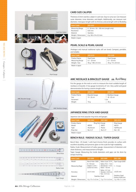Vol.11/23MEASURINGGauges/CalipersAlfaMirageCollectionPearlScalePearlGaugeItemCodeProductNameMeasuringRangeWeight/SizeMadeinJapan203-019PearlScale0.1-20mm96g/100x53mmPEARLSCALE&PEARLGAUGEAnalogueandmanualtraditionalstylesstillareloved.Compact,portable,andreliable.203-020PearlGauge0.1-50mm34g/73x20mmCardSizeCaliperCARDSIZECALIPERThickness0.3mmstainlesscaliperincardsize.Easytocarryout.Canmeasureouterdiameter,innerdiameter,anddepth.Additionally,canmeasurerootdiameter,interspacelengthwithitsthinnessandarclengthwithitsflexibility.ItemCodeMeasuringRangeResolutionMaterialWeight/DimensionsMadeinJapan203-0530-50mm/50-100mm(Lengthonly)0.05mmStainless6g/86x54x0.3mmAMCBraceletGaugeAMCNecklaceGauge203-004203-082203-010ItemCodeProductNameSizeIncrementWeight203-084BraceletGauge14-26cm10gAMCNECKLACE&BRACELETGAUGEPutthegaugeontheneckorwristtomeasurethemostsuitablelengthofnecklaceorbracelet.Ithasgaugeincrementsof1cm.Veryusefulandgooddemonstrationforhavingcustomslengthorder.203-083NecklaceGauge30-85cm30g1cmItemCodeProductNameModelTypeRingSizeMadeinJapan203-00440030AluminumNo.3-27JAPANESERINGSTICKANDGAUGEJapanesesizemostpopularringsticksandgauges.203-08240031PlasticNo.3-27203-010RingGauge40610HalfRoundNo.1-30RingStickGaugeBENCHRULE/RADIUSSCALE/TAPERGAUGEBenchRule:JISGrade1withhardchromefinishprovidesitssurfacewithexcellentdurabilityandpreventsglareonthescaleforhighreadability.RadiusScale:Measurementofradiusgauge,measurementofdiameterandsheetthickness,andmeasurementoflength.TaperGauge:Measuringtheinsidediametersandgapscanbedonebysimplyinserting.ItemCodeModelWeight/Dimensions203-098BenchRule1300510g/175x15x0.5mm203-099RadiusScale735707.5g/175x15x0.5mm203-100TaperGauge626001-15mm±0.05mm11g/148x17x1.2mmMeasuringRage0-150mm(Upper1mm/Lower0.5mm)±0.15mmRadius:R0.5-7mmDiameter:0.5-6mmRule:0-150mmRadius:±0.1mmDiameter:±0.05mmRule:±0.15mmAccuracyMaterialStainlessSteelStainlessSteelHardnessHv400moreRadiusScaleTaperGaugeBenchRule
