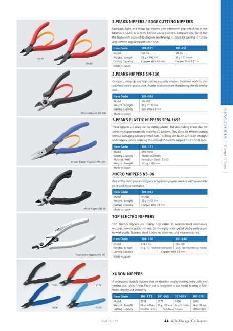 Vol.11/26Cutter/PliersBENCHTOOLS3.PeaksNippersSN-1303.PeaksPlasticNippersSPN-165STopElectroNippersENI-115217592002193170ⅡMicroNippersNS-06ItemCodeModelWeight/LengthCuttingCapacityMadeinJapan301-018SN-13090g/133mmIronWire2.0mm3.PEAKSNIPPERSSN-130Compact,sharptipandhighcuttingcapacitynippers.Excellentworkforthinstainlesswireorpianowire.Mastercraftsmenaresharpeningthetiponebyone.ItemCodeModelCuttingCapacityMaterial/HRCWeight/LengthMadeinJapan301-172SPN-165SPlasticφ2.0mmVanadiumSteel/52-60115g/165mm3.PEAKSPLASTICNIPPERSSPN-165SThesenippersaredesignedforcuttingplastic,butalsomakingthemidealforremovingsupportmaterialsmadeby3Dprinters.Theyallowforefficientcuttingwithoutdamagingdelicateprintedparts.Thelong,slimbladescanreachintotightandcomplexspaces,enablingtheremovalofmultiplesupportstructuresatonce.SM-06SM-01ItemCodeModelWeight/LengthCuttingCapacityMadeinJapan301-021SM-0155g/100mmCopperWire1.6mm301-051SM-0655g/115mmCopperWire1.0mm3.PEAKSNIPPERS/EDGECUTTINGNIPPERSCompact,light,andsharptipnipperswithelastomergripwhichfitsinthehandwell.SM-01issuitableforfineworksduetoitscompactsize.SM-06hasthebladewithangleof42degreesandfinetip,suitableforcuttinginnarrowareaswhereregularnipperscanʼtcut.ItemCodeModelWeight/LengthCuttingCapacityMadeinJapan301-012NS-0652g/105mmCopperWire0.8mmMICRONIPPERSNS-06OneofthemostpopularnippersinJapanesejewelrymarketwithreasonablepriceanditsperformance.ItemCodeModelWeight/LengthCuttingCapacityMadeinJapan301-100ENI-11545g/115mm(Whitecolorhandle)TOPELECTRONIPPERSTOPElectroNippersaremainlyapplicabletosophisticatedelectronics,watches,jewelry,goldsmithetc.Comfortgripwithspecialbladeenablesyoutoworkeasily.Stainlesssteelbladesexcelforrustandwearresistance.301-146ENI-10050g/108mm(Redcolorhandle)CopperWire1.2mmItemCodeModelWeight/LengthCuttingCapacity301-068217591g/150mm301-173219382g/140mmHardWire1.0mm301-069920064g/135mm301-070170Ⅱ54g/130mmSoftWire0.8mmXURONNIPPERSAstronganddurablenippersthatareidealforjewelrymaking,wirecraftsandvarioususe.Micro-ShearFlushcutisdesignedtocutmetalleavingaflushfinishcleanlyandsmoothly.SoftWire1.6mmAlfaMirageCollection