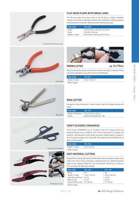 Vol.11/28BENCHTOOLSCutter/PliersAlfaMirageCollectionItemCodeModelShapeWeight/Length301-168FlatNosePlierswithBrassJaws6mmStainless/Brasstip98g/140mm(Brassjaw24x6mm)FLATNOSEPLIERSWITHBRASSJAWSTheflatnosepliershavebrassjawsonthetip.Brassishighlymalleable,makingitlesslikelytodamagesurfaceswhenholdingorshapingpreciousmetalsandothermaterials.Idealforjewelrymakingandrepair.ProngLifterFlatNosePliersWithBrassJawsItemCodeWeight/LengthMadeinJapan301-011102g/130mmPRONGLIFTERPliersfortakingthestonesoutfromthering.Notechniqueisrequired.Stonewillnotbedamaged.Long-selleritemfromAlfaMirage.RingCutterCraftScissorsChikamasaItemCodeWeight/LengthMadeinJapan301-13230g/130mmCRAFTSCISSORSCHIKAMASACraftScissorsCHIKAMASAareanexcellentchoiceforcuttinghard-to-cutbeadingthreadssuchasWildFireandFireLinefeaturingthestrengthandhardness.Manufacturedunderbeadsaccessorymakingexpert'sguidance.Eventhoughtheedgeisthin,theyofferthesharpnessanddurabilityforanidealcutforallusers.ItemCodeWeight/DimensionsOption301-14769g/40x40x120mmReplacementblade(301-148)RINGCUTTEREmergencyringcuttingtool.Ithelpsremoveringsfromfingersquicklyandsafely.SoftMaterialCuttersItemCodeModelWeight/LengthBladeOpen-width(tip)BladeLengthReplacementBlade/PlateMadeinJapan301-104SX5170g/195mm24mm53mmX5/PB-SX5SOFTMATERIALCUTTERSDesignedforcuttingsoftmaterial,leatherbelt,leatherproducts,rubbertube,cablecover,hose,wood,animalborn,gardeningtreesetc.Bladeandplasticplatecanbereplaced.ModelSX7hasusedratchetmechanism,sothatyoucancuteasilywithlightgripstrength.301-130SX7245g/230mm34mm65mmX7/PB-SX7