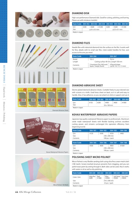 BENCHTOOLSHandtoolsVol.11/31DiamondAbrasiveSheetGritItemCodeSizeMadeinJapan304-465304-466304-467304-46850x100mm#150#200#400#600304-469#1000DIAMONDABRASIVESHEETElectro-plateddiamondabrasivesheets.Cuttablefreelytoyourdesiredsizewithscissorsoraknife.Usedbrasssheetonback,soitissoftandeasytohandle.Also,ithasadhesive,soyoucanattachonstickorsupportanduseit.DiamondDiskDIAMONDDISKHighcost-performanceDiamonddisk.Goodforcutting,polishing,andburring.Pleaseusewithminiaturemandrel.ItemCodeGritSizeMadeinJapan304-452#200304-457#1200304-453#600304-454#1200304-455#200304-456#600φ25x0.3mmφ22x0.1mmMicroPolinet100MeshKovaxWaterproofAbrasivePapersItemCodeGritSizeContents304-181#120KOVAXWATERPROOFABRASIVEPAPERSJapanesetopqualitywaterproofAbrasivepapertoprofessionals.Aluminumoxidemadewaterproofsheetswithflexiblebackingarchivesexcellentcuttingpower,andremainsunchangedtheoperationefficiencyfrombeginningtoend.304-182#240304-183#320304-184#400230x280mm100pcs/packItemCodeGritSizeContentsMadeinJapan304-185#500304-186#600304-187#800304-188#1000230x280mm100pcs/packItemCodeSizeContentsMadeinJapan304-220POLISHINGSHEETMICROPOLINETMicro-Polinetisveryflexiblesandingclothusingultrafinescreen-meshcloth(100mesh).Screen-meshedstructurepreventsfromclogging,andyoucanpolishexactpointbyseeingthroughit.Bothsidescanbeused.Alsoitworkswithwateroroilaswellasdrypolishing.304-222304-224304-223304-225Color/GritRed#1000IndigoBlue#600GrassGreen#4000LightOrange#3000Blue#2000210x280mm25pcs/packAbrasives/PolishingAlfaMirageCollectionDiamondFilesSetItemCodeModelLengthContentsMadeinJapan304-267TLD-44Roundshape(φ0.8,1.0,1.2,1.5mm)DIAMONDFILESNeedlefileswithindustrialdiamondintothesurfaceonthefile.Itworkswellforfine,detailswithitssmallsizefiles.Color-codedhandlesforfast,sureaccesstotheoneyouneed.304-266TLD-55Assortment(Flat,Half-round,Square,Triangle,Round)Cuttingsurface40mm,Length100mm