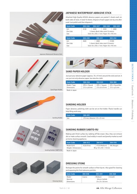 Vol.11/32JapaneseWaterproofAbrasiveStickSandPaperHolderSandingHolderJAPANESEWATERPROOFABRASIVESTICKAttachedHigh-QualityKOVAXabrasivepapersarepasted5sheetseachonbothsidesofstick,intotal10sheets.Disposeofeachpaperonebyoneafterused.Justpolishandthendisposeit.ItemCodeGritOneSideSize304-226#120304-227#240304-228#320304-229#4005sheets(BothSidestotal10sheets)Stick18x250x7mmPaper18x145mmItemCodeGritOneSideSize304-230#600304-231#800304-232#10005sheets(BothSidestotal10sheets)Stick18x250x7mmPaper18x145mmBENCHTOOLSHandtoolsAbrasives/PolishingItemCodeModel(Grit)Weight/DimensionsMadeinJapan304-412#320(Fine)SANDINGRUBBERSABITO-RUMakingsatinfinishsurfacebyrubbingofflikeeraser.Also,theycanremovedirtormakesurfacesmooth.Usedwidelyinwatchandjewelrymarketaswellashomecleaningappliance.304-411#120(Medium)304-410#46(Rough)40g/65x40×10mmSandingRubberSABITO-RUItemCodeModel/TypeDimensionsMadeinJapan304-326SPR-2/Round215xφ8mmSANDPAPERHOLDERJustputyourabrasivepaper(approx.76x41mm)aroundthestickandset.Itcanputnotonlyabrasivepaper,butalsothecloth.304-325SPR-1/Square215x8x8mm304-382SPR-3/Round-Mini215xφ5mmItemCodeSizeSANDINGHOLDERPaperabrasive,polishingclothcanbesetontheholder.Plastichandlecanhelpfilingworkeasy.304-491270mm,Abrasive125x25mmAlfaMirageCollectionItemCodeModelMaterialDimensions304-458CoarseDRESSINGSTONEReshapethepointsforsmoothsurfaceorfinertipetc.Alsogoodforcleaningandexposingthefreshabrasiveparticles.304-459Medium304-460SmoothSiliconCarbide25x25x50mmDressingStone