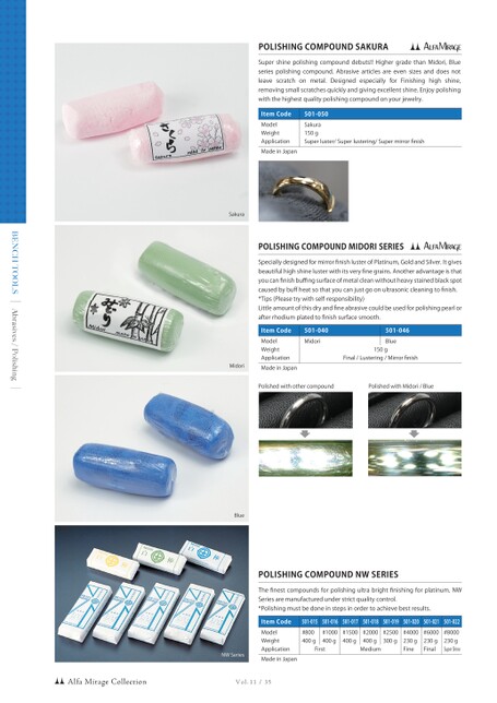 BENCHTOOLSVol.11/35Abrasives/PolishingPolishedwithothercompoundPolishedwithMidori/BlueMidoriBlueNWSeriesItemCodeModelWeightApplicationMadeinJapan501-040MidoriPOLISHINGCOMPOUNDMIDORISERIESSpeciallydesignedformirrorfinishlusterofPlatinum,GoldandSilver.Itgivesbeautifulhighshinelusterwithitsveryfinegrains.Anotheradvantageisthatyoucanfinishbuffingsurfaceofmetalcleanwithoutheavystainedblackspotcausedbybuffheatsothatyoucanjustgoonultrasoniccleaningtofinish.*Tips(Pleasetrywithself-responsibility)Littleamountofthisdryandfineabrasivecouldbeusedforpolishingpearlorafterrhodiumplatedtofinishsurfacesmooth.501-046Blue150gFinal/Lustering/MirrorfinishPOLISHINGCOMPOUNDSAKURASupershinepolishingcompounddebuts!!HighergradethanMidori,Blueseriespolishingcompound.Abrasivearticlesareevensizesanddoesnotleavescratchonmetal.DesignedespeciallyforFinishinghighshine,removingsmallscratchesquicklyandgivingexcellentshine.Enjoypolishingwiththehighestqualitypolishingcompoundonyourjewelry.ItemCodeModelWeightApplicationMadeinJapan501-050Sakura150gSuperluster/Superlustering/SupermirrorfinishItemCodeModelWeightApplicationMadeinJapan501-015#800400gPOLISHINGCOMPOUNDNWSERIESThefinestcompoundsforpolishingultrabrightfinishingforplatinum.NWSeriesaremanufacturedunderstrictqualitycontrol.*Polishingmustbedoneinstepsinordertoachievebestresults.501-016#1000400g501-017#1500400g501-018#2000400g501-019#2500300g501-020#4000230gFine501-021#6000230gFinal501-022#8000230gSuperShineMediumFirstSakuraAlfaMirageCollection