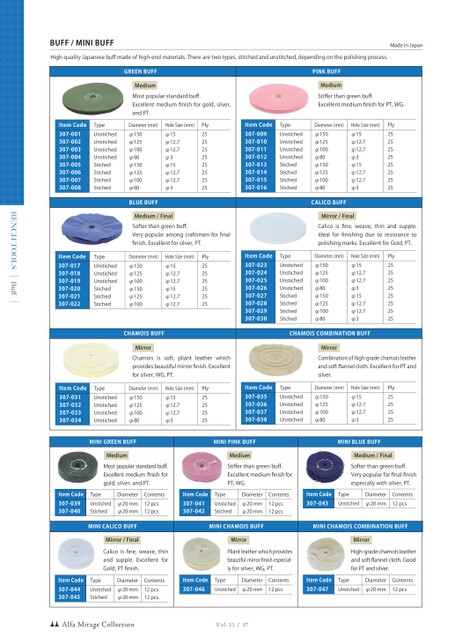 Vol.11/37BENCHTOOLSBuffMostpopularstandardbuff.Excellentmediumfinishforgold,silver,andPT.Calicoisfine,weave,thinandsupple.ExcellentforGold,PTfinish.Pliantleatherwhichprovidesbeautifulmirrorfinishespecial-lyforsilver,WG,PT.High-gradechamoisleatherandsoftflannelcloth.GoodforPTandsilver.ItemCode307-039307-040TypeUnstichedStichedDiameterφ20mmφ20mmContents12pcs12pcsItemCode307-044307-045TypeUnstichedStichedDiameterφ20mmφ20mmContents12pcs12pcsItemCode307-041307-042TypeUnstichedStichedDiameterφ20mmφ20mmContents12pcs12pcsItemCode307-043TypeUnstichedDiameterφ20mmContents12pcsItemCode307-046TypeUnstichedDiameterφ20mmContents12pcsItemCode307-047TypeUnstichedDiameterφ20mmContents12pcsMINIGREENBUFFMINICALICOBUFFMINICHAMOISBUFFMINICHAMOISCOMBINATIONBUFFStifferthangreenbuff.ExcellentmediumfinishforPT,WG.MINIPINKBUFFSofterthangreenbuff.Verypopularforfinalfinishespeciallywithsilver,PT.MINIBLUEBUFFMirrorMirrorMediumMediumAlfaMirageCollectionBUFF/MINIBUFFHigh-qualityJapanesebuffmadeofhigh-endmaterials.Therearetwotypes,stitchedandunstitched,dependingonthepolishingprocess.MadeinJapanMostpopularstandardbuff.Excellentmediumfinishforgold,silver,andPT.Stifferthangreenbuff.ExcellentmediumfinishforPT,WG.Softerthangreenbuff.Verypopularamongcraftsmenforfinalfinish.Excellentforsilver,PT.Calicoisfine,weave,thinandsupple.Idealforfinishingduetoresistancetopolishingmarks.ExcellentforGold,PT.Chamoisissoft,pliantleatherwhichprovidesbeautifulmirrorfinish.Excellentforsilver,WG,PT.Combinationofhigh-gradechamoisleatherandsoftflannelcloth.ExcellentforPTandsilver.ItemCode307-001307-002307-003307-004307-005307-006307-007307-008TypeUnstichedUnstichedUnstichedUnstichedStichedStichedStichedStichedDiameter(mm)φ150φ125φ100φ80φ150φ125φ100φ80HoleSize(mm)φ15φ12.7φ12.7φ3φ15φ12.7φ12.7φ3Ply2525252525252525ItemCode307-009307-010307-011307-012307-013307-014307-015307-016TypeUnstichedUnstichedUnstichedUnstichedStichedStichedStichedStichedDiameter(mm)φ150φ125φ100φ80φ150φ125φ100φ80HoleSize(mm)φ15φ12.7φ12.7φ3φ15φ12.7φ12.7φ3Ply2525252525252525ItemCode307-017307-018307-019307-020307-021307-022TypeUnstichedUnstichedUnstichedStichedStichedStichedDiameter(mm)φ150φ125φ100φ150φ125φ100HoleSize(mm)φ15φ12.7φ12.7φ15φ12.7φ12.7Ply252525252525ItemCode307-023307-024307-025307-026307-027307-028307-029307-030TypeUnstichedUnstichedUnstichedUnstichedStichedStichedStichedStichedDiameter(mm)φ150φ125φ100φ80φ150φ125φ100φ80HoleSize(mm)φ15φ12.7φ12.7φ3φ15φ12.7φ12.7φ3Ply2525252525252525ItemCode307-031307-032307-033307-034TypeUnstichedUnstichedUnstichedUnstichedDiameter(mm)φ150φ125φ100φ80HoleSize(mm)φ15φ12.7φ12.7φ3Ply25252525GREENBUFFBLUEBUFFCHAMOISBUFFCHAMOISCOMBINATIONBUFFCALICOBUFFPINKBUFFItemCode307-035307-036307-037307-038TypeUnstichedUnstichedUnstichedUnstichedDiameter(mm)φ150φ125φ100φ80HoleSize(mm)φ15φ12.7φ12.7φ3Ply25252525MediumMediumMedium/FinalMirror/FinalMirrorMirrorMirror/FinalMedium/Final