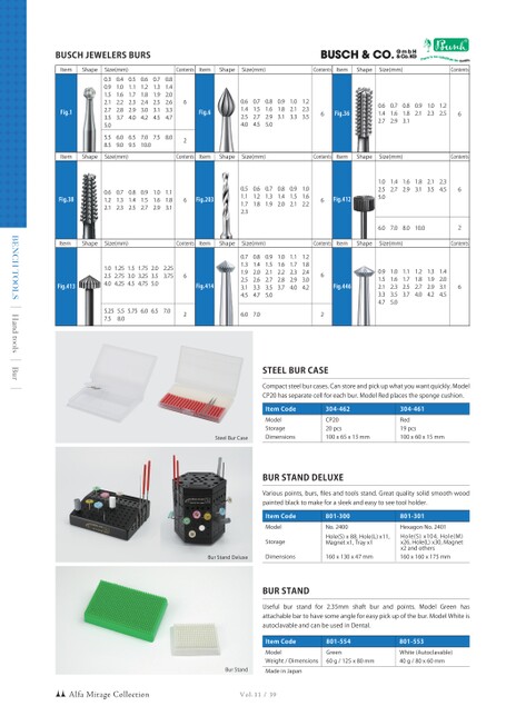 BENCHTOOLSVol.11/39HandtoolsBurItemCodeModelStorageDimensions304-461Red19pcs100x60x15mmSTEELBURCASECompactsteelburcases.Canstoreandpickupwhatyouwantquickly.ModelCP20hasseparatecellforeachbur.ModelRedplacesthespongecushion.304-462CP2020pcs100x65x13mmItemCodeModelWeight/DimensionsMadeinJapan801-554Green60g/125x80mmBURSTANDUsefulburstandfor2.35mmshaftburandpoints.ModelGreenhasattachablebartohavesomeangleforeasypickupofthebur.ModelWhiteisautoclavableandcanbeusedinDental.801-553White(Autoclavable)40g/80x60mmBUSCHJEWELERSBURS0.60.70.80.91.01.21.41.61.82.12.32.52.72.93.1ItemShapeSize(mm)6Fig.36ContentsItemShapeSize(mm)0.30.40.50.60.70.80.91.01.11.21.31.41.51.61.71.81.92.02.12.22.32.42.52.62.72.82.93.03.13.33.53.74.04.24.54.75.062Fig.15.56.06.57.07.58.08.59.09.510.0ContentsItemShapeSize(mm)6Fig.6Contents0.60.70.80.91.01.21.41.51.61.82.12.32.52.72.93.13.33.54.04.55.0ItemShapeSize(mm)6Fig.38Contents0.60.70.80.91.01.11.21.31.41.51.61.82.12.32.52.72.93.1ItemShapeSize(mm)6Fig.203Contents0.50.60.70.80.91.01.11.21.31.41.51.61.71.81.92.02.12.22.3ItemShapeSize(mm)6Fig.446Contents0.91.01.11.21.31.41.51.61.71.81.92.02.12.32.52.72.93.13.33.53.74.04.24.54.75.0ItemShapeSize(mm)Fig.413Contents1.01.251.51.752.02.252.52.753.03.253.53.754.04.254.54.755.065.255.55.756.06.57.07.58.0262ItemShapeSize(mm)Fig.414Contents0.70.80.91.01.11.21.31.41.51.61.71.81.92.02.12.22.32.42.52.62.72.82.93.03.13.33.53.74.04.24.54.75.06.07.062ItemShapeSize(mm)Fig.412Contents1.01.41.61.82.12.32.52.72.93.13.54.55.06.07.08.010.0SteelBurCaseAlfaMirageCollectionItemCodeModelDimensions801-301HexagonNo.2401160x160x175mmBURSTANDDELUXEVariouspoints,burs,filesandtoolsstand.Greatqualitysolidsmoothwoodpaintedblacktomakeforasleekandeasytoseetoolholder.801-300No.2400160x130x47mmStorageHole(S)x88,Hole(L)x11,Magnetx1,Trayx1Hole(S)x104,Hole(M)x26,Hole(L)x30,Magnetx2andothersBurStandDeluxeBurStand
