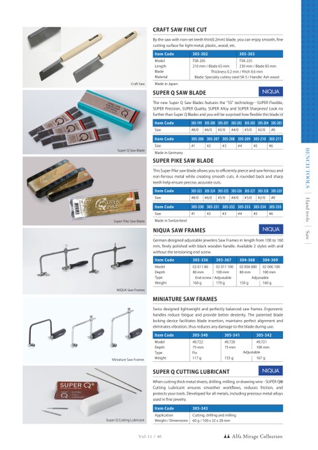 BENCHTOOLSVol.11/40HandtoolsSawItemCodeModelLengthBladeMaterialMadeinJapan305-303TSR-225230mm/Blade85mmCRAFTSAWFINECUTBythesawwithnon-setteeththin(0.2mm)blade,youcanenjoysmooth,finecuttingsurfaceforlightmetal,plastic,wood,etc.305-302TSR-205210mm/Blade65mmItemCodeModelDepthTypeWeight305-34149,72075mm155g305-34249,721100mm167gMINIATURESAWFRAMESSwissdesignedlightweightandperfectlybalancedsawframes.Ergonomichandlesreducefatigueandprovidebetterdexterity.Thepatentedbladelockingdevicefacilitatesbladeinsertion,maintainsperfectalignmentandeliminatesvibration,thusreducesanydamagetothebladeduringuse.305-34049,72275mmFix117gItemCodeApplicationWeight/DimensionsSUPERQCUTTINGLUBRICANTWhencuttingthickmetalsheets,drilling,milling,ordrawingwire-SUPERQ®CuttingLubricantensuressmootherworkflows,reducesfriction,andprotectsyourtools.Developedforallmetals,includingpreciousmetalalloysusedinfinejewelry.305-343Cutting,drillingandmilling60g/100x32x28mmThickness0.2mm/Pitch0.6mmBlade:SpecialtycutlerysteelSK-5/Handle:AshwoodItemCodeModelDepthTypeWeight304-3680200608080mm150g304-36902006100100mm160gNIQUASAWFRAMESGermandesignedadjustablejewelersSawFramesinlengthfrom100to160mm,finelypolishedwithblackwoodenhandle.Available2styleswithandwithoutthetensioningendscrew.305-336020118080mm160g305-36702011100100mm170gEndscrew/AdjustableAdjustableAdjustableSuperQSawBladeCraftSawSuperPikeSawBladeItemCodeSize305-199#8/0SUPERQSAWBLADE305-200#6/0305-201#5/0305-202#4/0305-203#3/0305-204#2/0305-205#0ItemCodeSizeMadeinGermany305-206#1305-207#2305-208#3305-209#4305-210#5305-211#6ThenewSuperQSawBladesfeaturesthe"5S"technology…SUPERFlexible,SUPERPrecision,SUPERQuality,SUPERAlloyandSUPERSharpness!LooknofurtherthanSuperQBladesandyouwillbesurprisedhowflexiblethisbladeis!ItemCodeSize305-323#8/0SUPERPIKESAWBLADE305-324#6/0305-325#5/0305-326#4/0305-327#3/0305-328#2/0305-329#0ItemCodeSizeMadeinSwitzerland305-330#1305-331#2305-332#3305-333#4305-334#5305-335#6ThisSuperPikesawbladeallowsyoutoefficientlypierceandsawferrousandnon-ferrousmetalwhilecreatingsmoothcuts.Aroundedbackandsharpteethhelpensureprecise,accuratecuts.AlfaMirageCollectionSuperQCuttingLubricantNIQUASawFramesMiniatureSawFrames