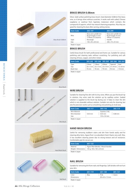 BENCHTOOLSVol.11/45HandtoolsHandWashBrushItemCodeColorDimensionsMadeinJapan601-119BlueNAILBRUSHSuitableforremovingdirtfromnailsandfingertips.Softbristleswillnothurtyourskin.601-120Pink601-121Green28x63x13mmNailBrushItemCodeMaterialWeight/DimensionsMadeinJapan601-122Agavefiber(Bristle)/Wood(Handle)105g/48x105x24mmHANDWASHBRUSHUsefulforremovingstubbornstainsanddirtfromhandseasilyandforcleaningdirtyitems.Agavefiverissoabsorbentthatitfoamsverywell.Also,ithasexcellentcleaningpowerduetostrongtextureandoilresistance.Comfortablegripforsecureuse.ItemCodeWireMaterialWireDiameterSizeMadeinJapan305-1170.03mmWIREBRUSHSuitableforcleaningfinedirtwithitstinywires.Whenyouputthebrushtipinsolution,tinywiressoakthesolutionupbycapillaryaction.Soakedsolutionissuppliedtothebrushtipduringuse.Ithelpstocleanthedirtwhichisnotcleanablewithoutsolution.Suitablenotonlyforcleaning,butalsoforprecisionworkssuchassmoothingandpolishingatsmallarea.305-118Stainless316L0.05mm110x3.0mm305-1190.08mmItemCodeTypeSizeBrashSizeMadeinJapan305-2632Rows235x12mm70mm305-2643Rows235x15mm70mm305-2654Rows235x18mm70mm305-266Tapered215x40mm95mm305-267Oval123x60mm110mmBRASSBRUSHUsefulbrassbrushforbothprofessionalandhomeuse.Suitableforvariouspolishingandcleaningtaskswithoutscratching.Forpolishingandsoftcleaningofbrass,copper,andothermetals.BrassBrushWireBrushItemCodeStyleSizeMadeinJapan305-197Rectangle130x45x28mm305-299Handle240x19x25mmBRASSBRUSH0.08mmSilver,Goldsurfacepolishingbrassbrush.Useddiameter0.08mmfinebrasswire,soitbringsshinewithoutscratches.Itworkswellwithcalled,ChinesesoapberryorwashnutfromSapindusmukorossiwhichcontainsthecompoundofsaponin,whichhasnaturalcleansingproperties.Alsotheyaregoodforcleaningthedustaftercarving,settingstones.AlfaMirageCollectionBrassBrush0.08mmBrasswireφ0.08mmBrushlength16mm4Rows15ColumnsBrasswireφ0.08mmBrushlength15mm12Rows23ColumnsWire