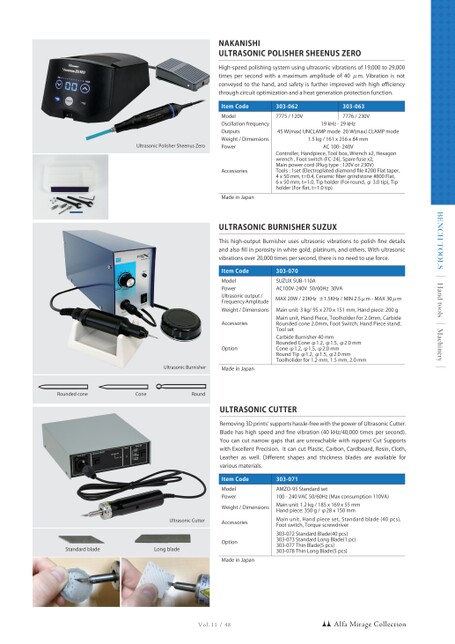 BENCHTOOLSVol.11/48HandtoolsMachineryUltrasonicPolisherSheenusZeroUltrasonicBurnisherUltrasonicCutterItemCodeModelOscillationfrequencyOutputsWeight/DimensionsPowerMadeinJapan303-0627775/120VNAKANISHIULTRASONICPOLISHERSHEENUSZEROHigh-speedpolishingsystemusingultrasonicvibrationsof19,000to29,000timespersecondwithamaximumamplitudeof40μm.Vibrationisnotconveyedtothehand,andsafetyisfurtherimprovedwithhighefficiencythroughcircuitoptimizationandaheatgenerationprotectionfunction.303-0637776/230V19kHz-29kHz45W(max)UNCLAMPmode20W(max)CLAMPmode1.5kg/161x256x84mmAC100-240VController,Handpiece,Toolbox,Wrenchx2,Hexagonwrench,Footswitch(FC-24),Sparefusex2,Mainpowercord(Plugtype:120Vor230V)Tools:1set(Electroplateddiamondfile#200Flattaper,4x50mm,t=0.4,Ceramicfibergrindstone#800Flat,6x50mm,t=1.0,Tipholder(Forround,φ3.0tip),Tipholder(Forflat,t=1.0tip)AccessoriesItemCodeModelPowerWeight/DimensionsMadeinJapan303-070SUZUXSUB-110AAC100V-240V50/60Hz30VAMainunit:3kg/95x270x151mm,Handpiece:200gULTRASONICBURNISHERSUZUXThishigh-outputBurnisherusesultrasonicvibrationstopolishfinedetailsandalsofillinporosityinwhitegold,platinum,andothers.Withultrasonicvibrationsover20,000timespersecond,thereisnoneedtouseforce.AccessoriesOptionUltrasonicoutput/FrequencyAmplitudeMAX20W/23KHz±1.5KHz/MIN2.5μm-MAX30μmMainunit,HandPiece,Toolholderfor2.0mm,CarbideRoundedcone2.0mm,FootSwitch,HandPiecestand,ToolsetCarbideBurnisher40mmRoundedConeφ1.2,φ1.5,φ2.0mmConeφ1.2,φ1.5,φ2.0mmRoundTipφ1.2,φ1.5,φ2.0mmToolholiderfor1.2mm,1.5mm,2.0mmItemCodeModelPowerMadeinJapan303-071AMZO-95Standardset100-240VAC50/60Hz(Maxconsumption110VA)ULTRASONICCUTTERRemoving3Dprintsʼsupportshassle-freewiththepowerofUltrasonicCutter.Bladehashighspeedandfinevibration(40kHz/40,000timespersecond).Youcancutnarrowgapsthatareunreachablewithnippers!CutSupportswithExcellentPrecision.ItcancutPlastic,Carbon,Cardboard,Resin,Cloth,Leatheraswell.Differentshapesandthicknessbladesareavailableforvariousmaterials.OptionMainunit,Handpieceset,Standardblade(40pcs),Footswitch,Torquescrewdriver303-072StandardBlade(40pcs)303-073StandardLongBlade(1pc)303-077ThinBlade(5pcs)303-078ThinLongBlade(5pcs)RoundedconeConeRoundStandardbladeLongbladeMainunit:1.2kg/185x169x55mmHandpiece:350g/φ28x150mmWeight/DimensionsAccessoriesAlfaMirageCollection