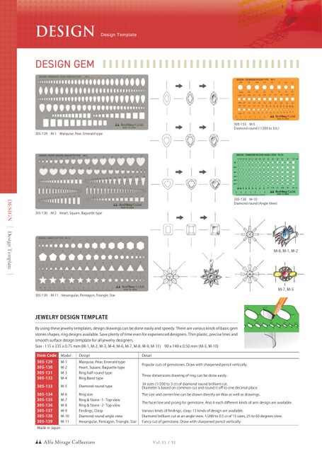 DESIGNDesignTemplateDESIGNDesignTemplateVol.11/51305-129M-1Marquise,Pear,Emeraldtype305-133M-5Diamondround(1/200to3ct.)305-138M-10Diamondround(AngleView)305-130M-2Heart,Square,Baguettetype305-139M-11Hexangular,Pentagon,Triangle,StarM-8,M-1,M-2M-7,M-5JEWELRYDESIGNTEMPLATEItemCode305-129305-130305-131305-132305-134305-135305-136305-137305-138305-139MadeinJapanModelM-1M-2M-3M-4M-6M-7M-8M-9M-10M-11DesignMarquise,Pear,EmeraldtypeHeart,Square,BaguettetypeRinghalf-roundtypeRingBandtypeRingsizeRing&Stone-1-TopviewRing&Stone-2-TopviewFindings,ClaspDiamondroundangleviewHexangular,Pentagon,Triangle,StarPopularcutsofgemstones.Drawwithsharpenedpencilvertically.Threedimensionsdrawingofringcanbedoneeasily.Thefacetlineandprongforgemstone.Also6eachdifferentkindsofarmdesignareavailable.DetailThesizeandcenterlinecanbedrawndirectlyonWaxaswellasdrawings.Variouskindsoffindings,clasp.15kindsofdesignareavailable.Diamondbrilliantcutatanangleview.1/200to0.5ctof15sizes,25to60degreesview.Fancycutofgemstone.Drawwithsharpenedpencilvertically.34sizes(1/200to3ct)ofdiamondroundbrilliantcut.Diameterisbasedoncommoncutandrounditofftoonedecimalplace.305-133M-5DiamondroundtypeByusingthesejewelrytemplates,designdrawingscanbedoneeasilyandspeedy.Therearevariouskindsofbasicgemstonesshapes,ringdesignsavailable.Saveplentyoftimeevenforexperienceddesigners.Thinplastic,preciselinesandsmoothsurfacedesigntemplateforalljewelrydesigners.Size:115x235x0.75mm(M-1,M-2,M-3,M-4,M-6,M-7,M-8,M-9,M-11)90x140x0.50mm(M-5,M-10)DESIGNGEMAlfaMirageCollection