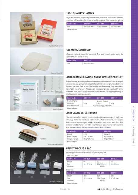 Vol.11/54STOREFRONTCleaning/ClothAlfaMirageCollectionHighQualityChamoisCleaningClothSEPJewelryProtectItemCodeSizeMadeinJapan601-006120x120mmHIGHQUALITYCHAMOISHighperformanceprocessingChamoiswhichhassoftsurfaceandremovesmoisture,oil,fingerprintandbringsbackitsoriginalshineeasilyandquickly.601-007120x180mm601-008150x150mmItemCodeModelBristleLengthWeight/LengthMadeinJapan801-557145G145x30mm80g/295mmANTI-STATICEFFECTBRUSHTheanti-staticeffectbrushisaprofessional-gradetooldesignedfordailycareofluxuryitemslikehandbagsandwatches.Madewithconductiveacrylicfiberscoatedwithcoppersulfide,itremovesbothstaticanddust.Thedurablewoodenhandleprovidesacomfortablegrip,makingitanessentialtoolformaintainingtheoriginalconditionofyourvaluables.801-558RabbitG100x30mm40g/115mmItemCodeProductNameContentsLiquidIngredientMadeinJapan601-13910gANTI-TARNISHCOATINGAGENTJEWELRYPROTECTLatestfluorinetechnologychemistrypreventsdiscoloration&blackeningofaccessories.JustapplyonjewelryandkeeptheJewelryoriginalcondition!Noirritantsareused.Safetouse.Theliquidisnotflammable.Easytransporta-tion.With10gofjewelryProtect,canbecoatedsimplering(width5mm,diameter2cm,about10㎠)around450pcs(4500㎠.)bydippingtheringintheliquid,andputtingoutquick.601-14030g601-14150gItemCodeSize601-114220x255mmCLEANINGCLOTHSEPCleaningclothdesignedfordiamond.Thissoftsmoothclothworksforgemstoneandpearlsaswell.JewelryProtectFluorineCompound(100%)ItemCodeModelSizeContentsMadeinJapan801-532D1Y30x18mm801-533D2Y33x17mm801-534D3Y37x21mm100pcsPRICETAGCASE&TAGItemCodeModelSizeContents801-529D132x22mm801-530D235x19.5mm801-531D340x24mm100pcsPricetagplasticcasewiththread,100piecesperpack.PriceTagCasePriceTagPriceTagCase&TagD1D2D3Anti-staticEffectBrushNocoatingNewCoatedwithJewelryProtect145GRabbitG