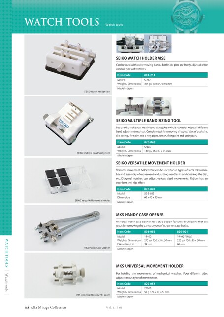 Vol.11/61WATCHTOOLSWatchtoolsMKSHandyCaseOpenerItemCodeModelWeight/DimensionsDiameteruptoMadeinJapan801-05619400215g/150x50x30mm39mmMKSHANDYCASEOPENERUniversalwatchcaseopener.ItsVstyledesignfeaturesdoublepinsthataregreatforremovingthevarioustypesofscrew-oncasebacks.820-00119460(Wide)220g/150x90x30mm60mmMKSUniversalMovementHolderItemCodeModelWeight/DimensionsMadeinJapan820-0542160050g/70x30x25mmMKSUNIVERSALMOVEMENTHOLDERForholdingthemovementsofmechanicalwatches.Fourdifferentsidesadjustvarioustypeofmovements.AlfaMirageCollectionItemCodeModelWeight/DimensionsMadeinJapan820-048S-926140g/96x87x35mmSEIKOMULTIPLEBANDSIZINGTOOLDesignedtomakeyourwatchbandsizingjobsawholeloteasier.Adjusts7differentbandadjustmentmethods.Completetoolforremovingalltypes/sizesofpushpins,clipsprings,freepinsandc-ringpipes,screws,fixingpinsandspringbars.ItemCodeModelDimensionsMadeinJapan820-049SE-S-68260x40x15mmSEIKOVERSATILEMOVEMENTHOLDERVersatilemovementholderthatcanbeusedforalltypesofwork.Disassem-blyandassemblyofmovementandputtingneedlesinandcleaningthedial,etc.Diagonalnotchescanadjustvarioussizedmovements.Rubberhasanexcellentanti-slipeffect.SEIKOWatchHolderViseSEIKOMultipleBandSizingToolSEIKOVersatileMovementHolderItemCodeModelWeight/DimensionsMadeinJapan801-214S-212395g/108x97x50mmSEIKOWATCHHOLDERVISECanbeusedwithoutremovingbands.Bothsidepinsarefreelyadjustableforvarioustypesofwatches.WATCHTOOLSWatchtools