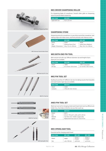 Vol.11/64WATCHTOOLSWatchtoolsMKSBoth-EndPinToolMKSPinToolSetANEXPinToolSetItemCodeModelPinSize820-008199000.7x8mm/0.9x8mmMKSBOTH-ENDPINTOOLBothendpintoolwithcap.Differentdiametersizeandlengthofpins.Sparepinsareavailable.820-00719901(LongType)0.7x8mm/0.8x16mmItemCodeModelContents820-015355003Pins(0.7,0.8,1.0mm)MKSPINTOOLSETQualitypinpunchesof3differentsizesets,fortakingoutpinsfrombraceletsandwatchbands.Sparetipsareavailable.ItemCodeModelSizeMaterialOption820-07268-P360mm/Pinsφ0.7,φ0.8,φ0.9x20mmTip:Pianowire/Holder:CopperalloyReplacementtip(5pcs)0.7,0.8,0.9mmANEXPINTOOLSETWatchpintoolsetforchangingmetalwatchband.Eachsizehasdifferentpinholderlines,thathelpstofindthesizeyouliketopickup.MKSDriverSharpeningRollerMKSArkansasStone/IndianStoneItemCodeApplicableSize820-004Uptoφ6mmMKSDRIVERSHARPENINGROLLERForsharpeningbladeofscrewdrivers.Smoothrollersglideonsharpeningstoneforprecisebladesharpening.ItemCodeModelTypeWeight/Dimensions820-00626500ArkansasStone(Fine)50g/25x6x100mmSHARPENINGSTONESharpeningstoneforscrewdrivers.Incaseoftipcrackofthescrewdriver,startmakingshapewithIndianstone,andfinishpreciselywithArkansasstone.820-00544600IndianStone(Medium)90g/26x16x100mmMKSSpring-BarToolItemCodeSize801-202φ6x100mmMKSSPRING-BARTOOLEssentialtoolforchangingwatchband.801-203φ0.8mm801-204φ2.0mmModelTIP460-2(10pcs)46000TIP460-3(10pcs)AlfaMirageCollection